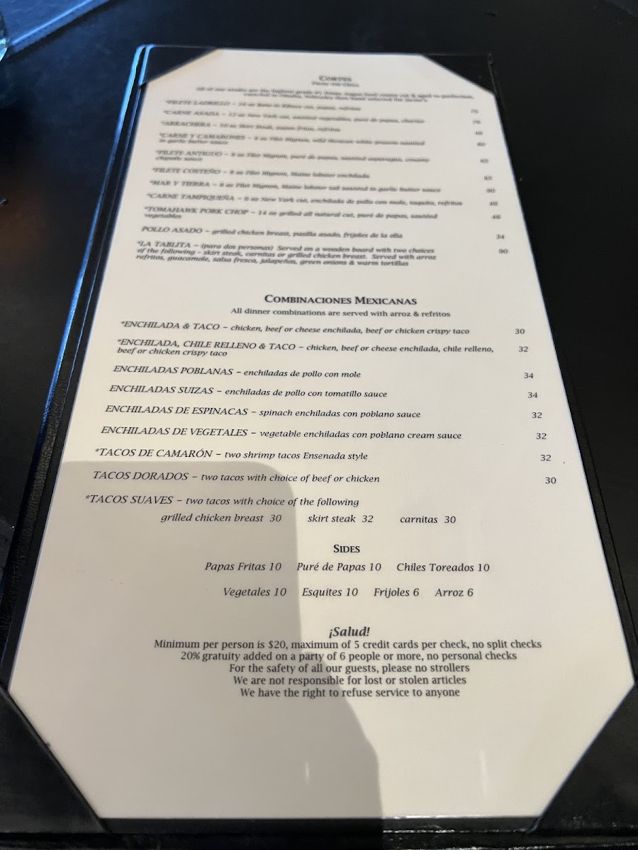 6 oz New York cut, enchilada de pollo con mole, taquito, refritos
